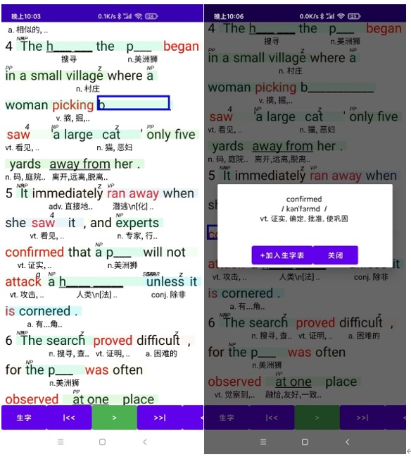 對(duì)于聽聽?wèi)浺魜碚f,聽單詞頁,重復(fù)循環(huán)朗讀單詞。單詞的重復(fù)次數(shù),以整編文章的配置為準(zhǔn)。點(diǎn)擊生字兩字,可以配置聆聽次數(shù)。 加入生字表的單詞,只顯示首字母,目的是記憶單詞發(fā)音的時(shí)候,回想單詞發(fā)音的時(shí)候,不能更加文字想發(fā)音,正確的根據(jù)發(fā)音想文字。這個(gè)順序相反,學(xué)英語會(huì)越來越困難。 點(diǎn)擊對(duì)應(yīng)的單詞可以加入生字表,或者移除之。移除生字后在首頁的后臺(tái),及本頁不在播放。 應(yīng)該少聽單詞,而通過聽短語和句子來記憶單詞的發(fā)音。單詞在句子中的發(fā)音,會(huì)有根據(jù)意思而變化的。