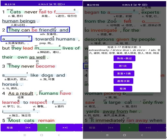 對于聽聽?wèi)浺?,圖中的框框,表示正在播放的短語。隨著播放的,這個框框跟隨著跳動。 可以點擊圖中的單詞,會播放對應(yīng)的短語。 長按對應(yīng)的單詞,會彈出本短語的配置情況,可以選擇相應(yīng)的配置。熟悉的選擇跳過,陌生的選擇重復(fù)+3遍。這個配置在本頁和后臺播放會有效。太簡單的短語,就沒必要繼續(xù)聽。 不懂的單詞也可以長按,彈出窗口后,會顯示單詞的音標(biāo)(如果有),和顯示中文翻譯。