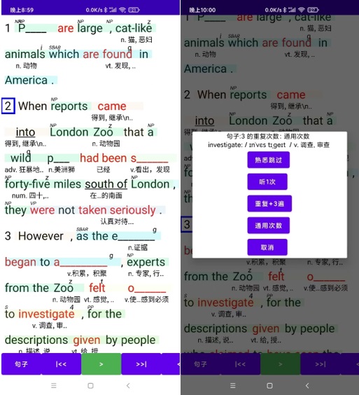 如果有單詞不懂,或想修改聆聽次數(shù),可以長按對應(yīng)單詞的英文,會彈出對應(yīng)的對話框。對話框顯示的當(dāng)前句子的配置,對于難句可以配置重復(fù)次數(shù)3次或者6次。對于簡單的句子可以選擇熟悉跳過,這個配置在本頁面和后臺聆聽均生效。